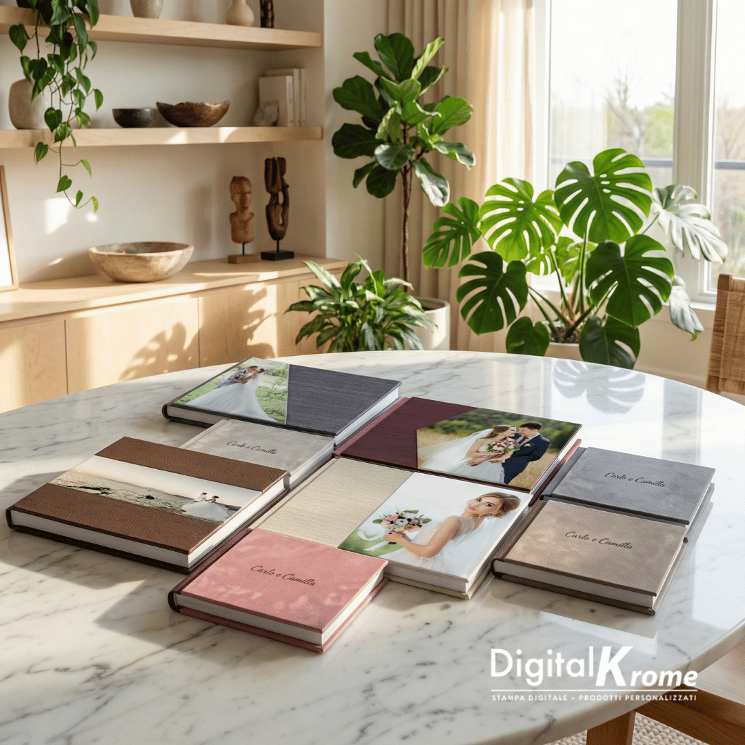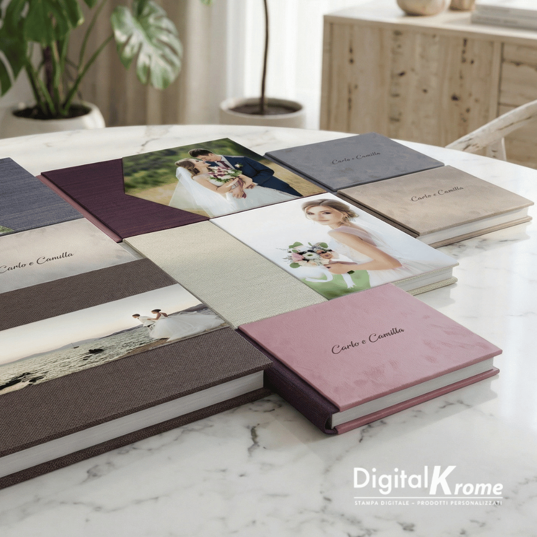 Ogni album è fornito in una preziosa teca con base in legno naturale laccato opaco e plexiglass trasparente, pensata per custodire con eleganza e protezione i tuoi ricordi più importanti.